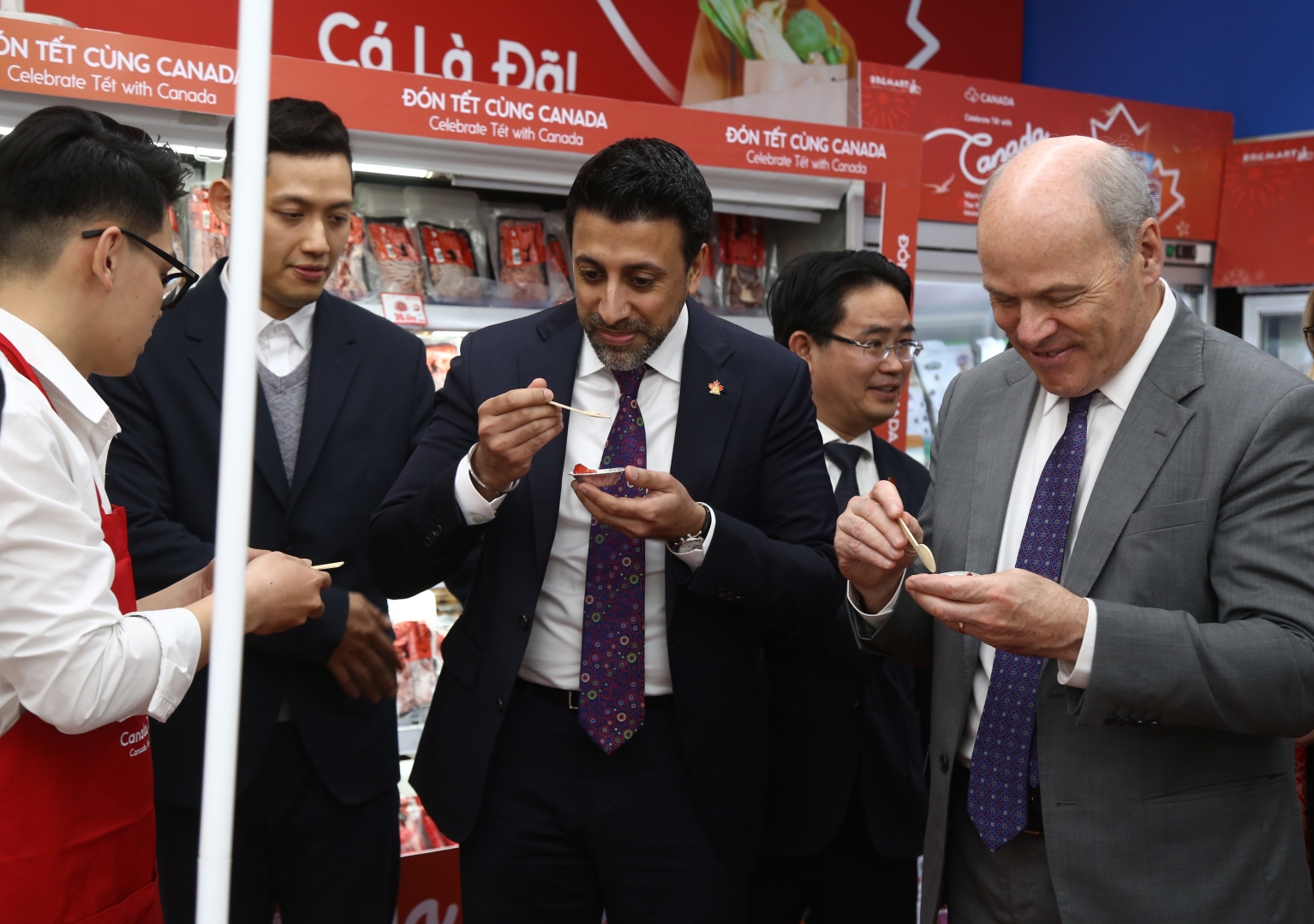 Bộ trưởng Maninder Sidhu cũng thưởng thức các món ăn được chế biến từ nông sản, thực phẩm Canada ngay tại siêu thị. Ông bày tỏ sự hào hứng khi thấy món tráng miệng quen thuộc gồm sữa chua, dâu tây và việt quất tươi ngay tại Việt Nam, cũng như những món ăn được chế biến với thịt bò mềm ngọt - minh chứng sinh động cho sự giao thoa ẩm thực giữa hai quốc gia.