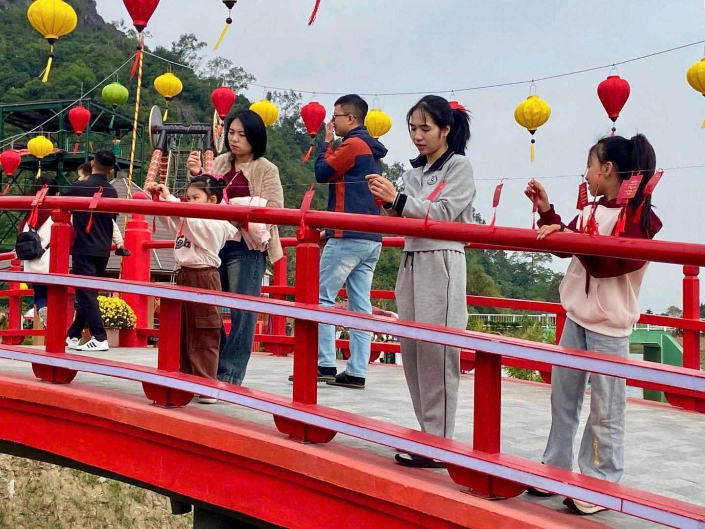 Du khách treo thẻ cầu an trên Cầu Đỏ